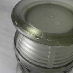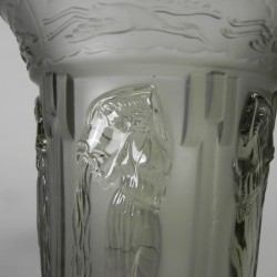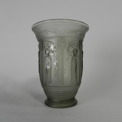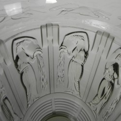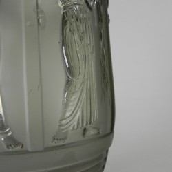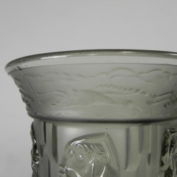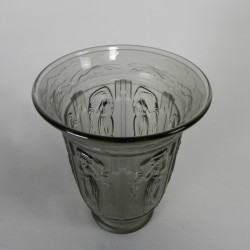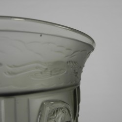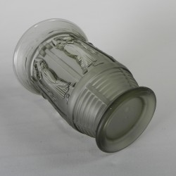 This Art Deco-era model is made of thick-walled, light gray pressed smoked glass.