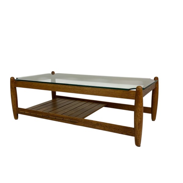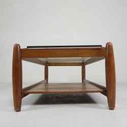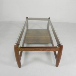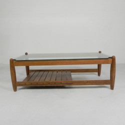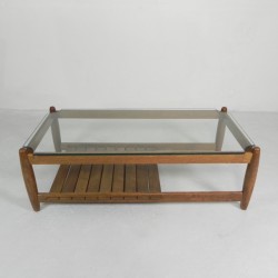 Elegant coffee table from the 1960s with a clear glass top and a refined wooden base.