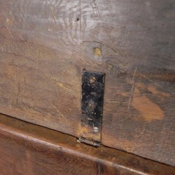The solid oak, simple construction, and hand-forged details reflect the practical craftsmanship of rural life at that time.