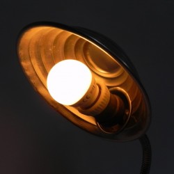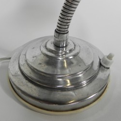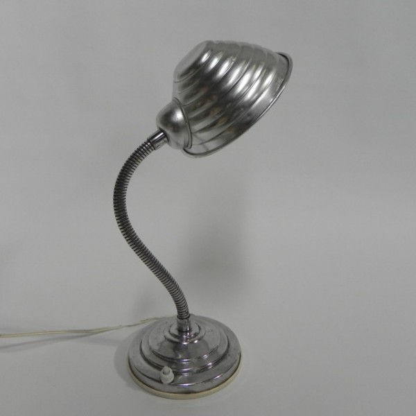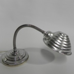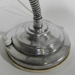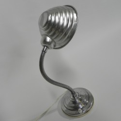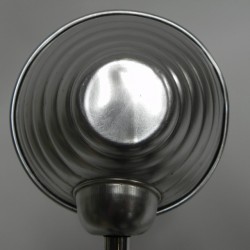 Height: 43 cm (maximum with hood up).Width: 13 cm.Depth: 15 cm (= Ø hood).The lamp has a large bulb holder (E27).Origin: Belgium, 1960s.Material: aluminum.