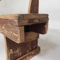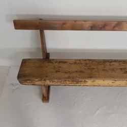 The wood of the bench has a beautiful patina, created by multiple layers of paint and years of wear, giving the bench a unique, authentic look.