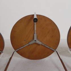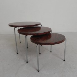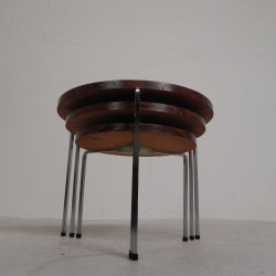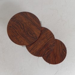 The smallest table is missing a very small piece of veneer in the edge (see detail photo).