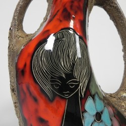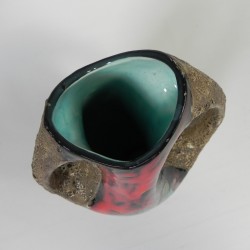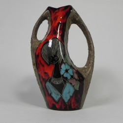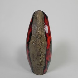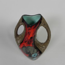 Bijzondere vintage vaas in Fat Lava-stijl, uitgevoerd in warme roodtinten met ruwe lava-structuur en opengewerkte handgrepen.