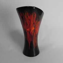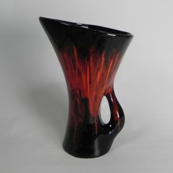 Een echte fifties vaas uitgevoerd in een combinatie van bruin, rood en zwart glazuur met glanzende afwerking.