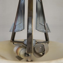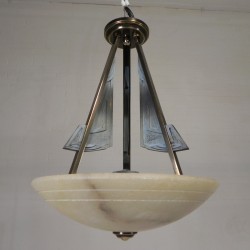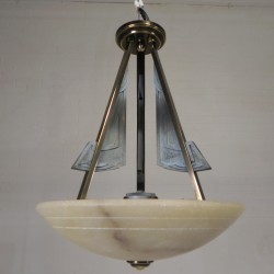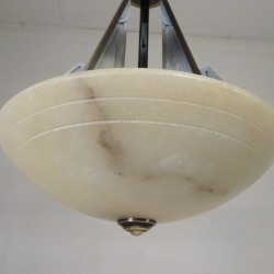 Elegante Art Deco-stijl hanglamp uit de jaren ’80, voorzien van een prachtige albasten schaal die warm en diffuus licht verspreidt.