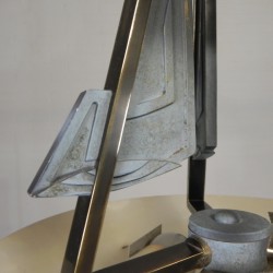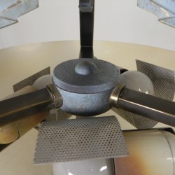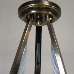 De schaal hangt sierlijk aan drie slanke messing staven.