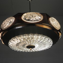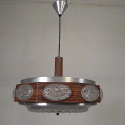Stijlvolle vintage hanglamp met een karakteristieke combinatie van houtprint, metaal en decoratief geperst glas.