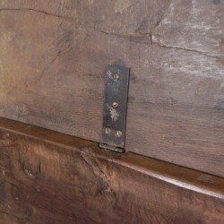 Het massieve eiken, de eenvoudige constructie en de handgesmede details weerspiegelen het praktische vakmanschap van het plattelandsleven in die tijd.