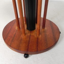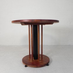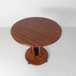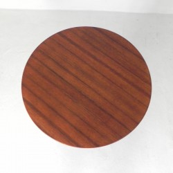 Deze teakhouten tafel heeft een rond blad en een centrale poot, wat zorgt voor een eenvoudig, doch elegant ontwerp.