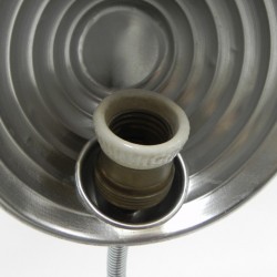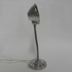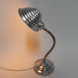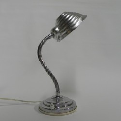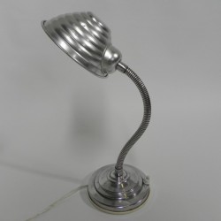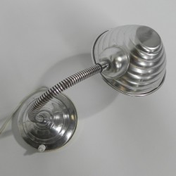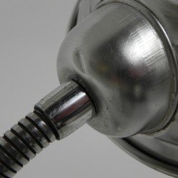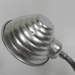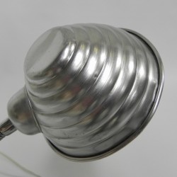 Hoogte: 43 cm (maximaal met kap omhoog).Breedte: 13 cm.Diepte: 15 cm (= Ø kap).De lamp is voorzien van een grote fitting (E27).Herkomst: België, jaren '60.Materiaal: aluminium.