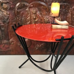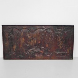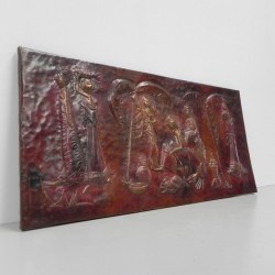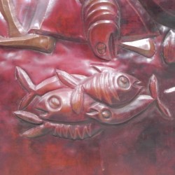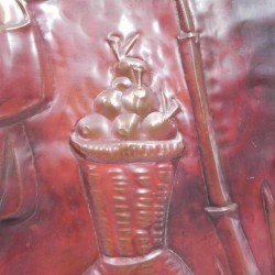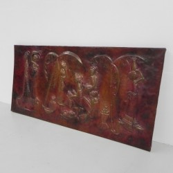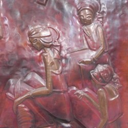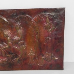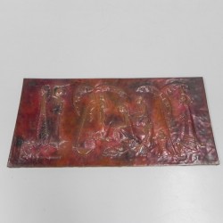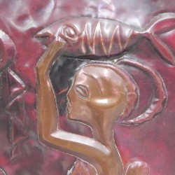 vrouwen, palmbomen, potten en vissen in het koper geslagen.